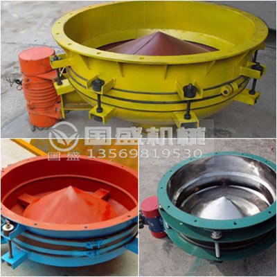 振动给料斗是用螺栓固定在储料仓下部,料斗内装有球面活化器,它将水平方向的激振力分解为沿球面法线方向和切线方向的分力。法线方向沿放射方向传递到物料深处,从而破坏了料仓内的垂直料拱,促使活化器上部的物料从中心向四周快速移动,再沿仓壁下滑,实现物料的整体流动,从出料口均匀排出。